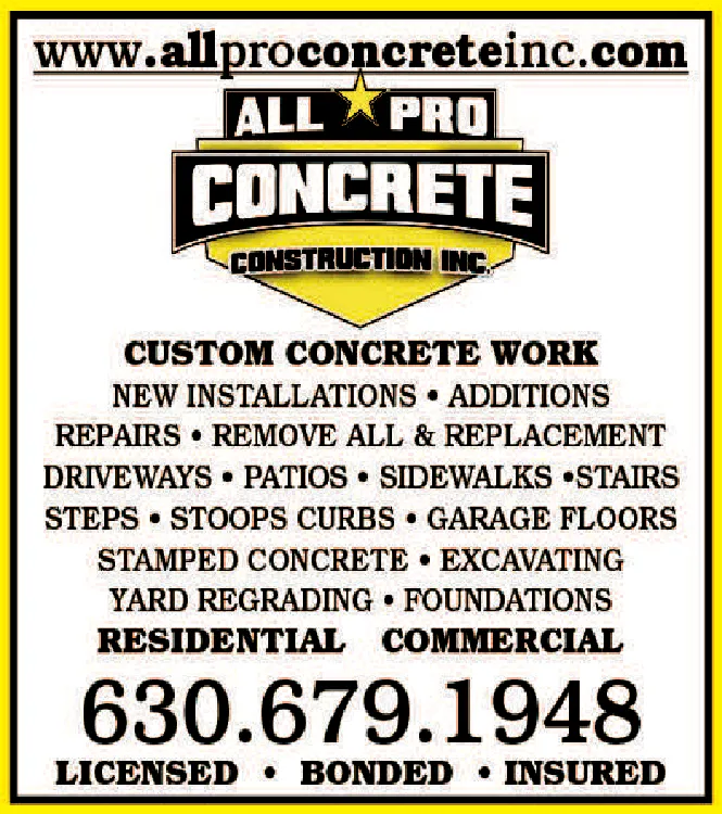 www.allproconcreteinc.com ALLPRO CONCRETE CONSTRUCTION INC CUSTOM CONCRETE WORK NEW INSTALLATIONS ADDITIONS REPAIRS REMOVE ALL & REPLACEMENT DRIVEWAYS PATIOS SIDEWALKS STAIRS STEPS STOOPS CURBS GARAGE FLOORS STAMPED CONCRETE EXCAVATING YARD REGRADING FOUNDATIONS RESIDENTIAL COMMERCIAL 630.679.1948 LICENSED BONDED INSURED www.allproconcreteinc.com ALLPRO CONCRETE CONSTRUCTION INC CUSTOM CONCRETE WORK NEW INSTALLATIONS ADDITIONS REPAIRS REMOVE ALL & REPLACEMENT DRIVEWAYS PATIOS SIDEWALKS STAIRS STEPS STOOPS CURBS GARAGE FLOORS STAMPED CONCRETE EXCAVATING YARD REGRADING FOUNDATIONS RESIDENTIAL COMMERCIAL 630.679.1948 LICENSED BONDED INSURED